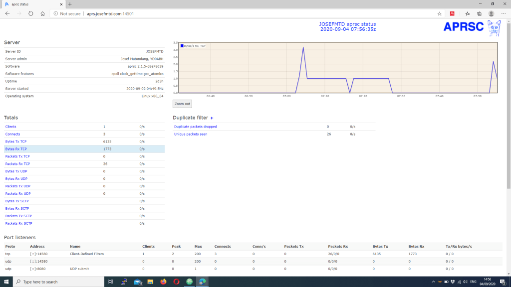 The server is now available to be accessed by APRS-IS applications such as APRS-Droid and/or APRX gateway, via port 14580 and 10152.