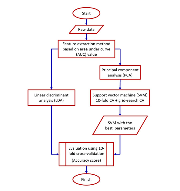Setelah proses ini, matriks dataset menjadi 210 nilai AUC untuk empat sensor, nilai ini dipakai untuk melakukan proses Linear Discriminant Analysis ataupun Principal Component Analysis + Support Vector Machine.