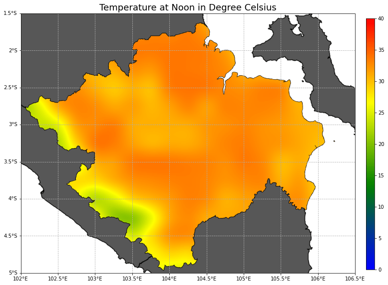 Setelah menggunakan fungsi di atas, akan keluar sebuah gambar di Jupyter Notebook yang dapat diklik kanan dan di simpan sebagai file. Contoh gambarnya dapat dilihat di bawah ini. Menggunakan data raster temperatur, data vektor batas administrasi, kita dapat menunjukkan gambar sederhana yang dapat merepresentasikan sebaran temperatur di sekitar provinsi Sumatera Selatan pada siang hari.