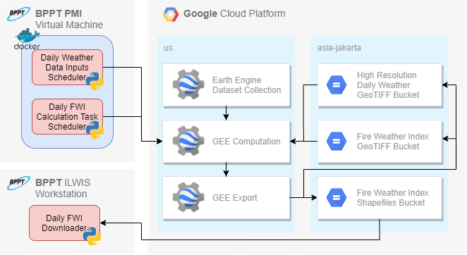 Indonesian Fire Danger Rating System is powered by the Canadian Forest Fire Weather Index System (CFFWIS). This application is capable of exporting weather data and calculation of FWI based on the processed weather data. Using Google Cloud Storage and Google Earth Engine API, new data is downloaded every day to be processed in the existing InaFDRS workflow. This application supports the InaFDRS application (https://inafdrs.ptpsw.bppt.go.id), also accessible in http://gee-fwi.herokuapp.com