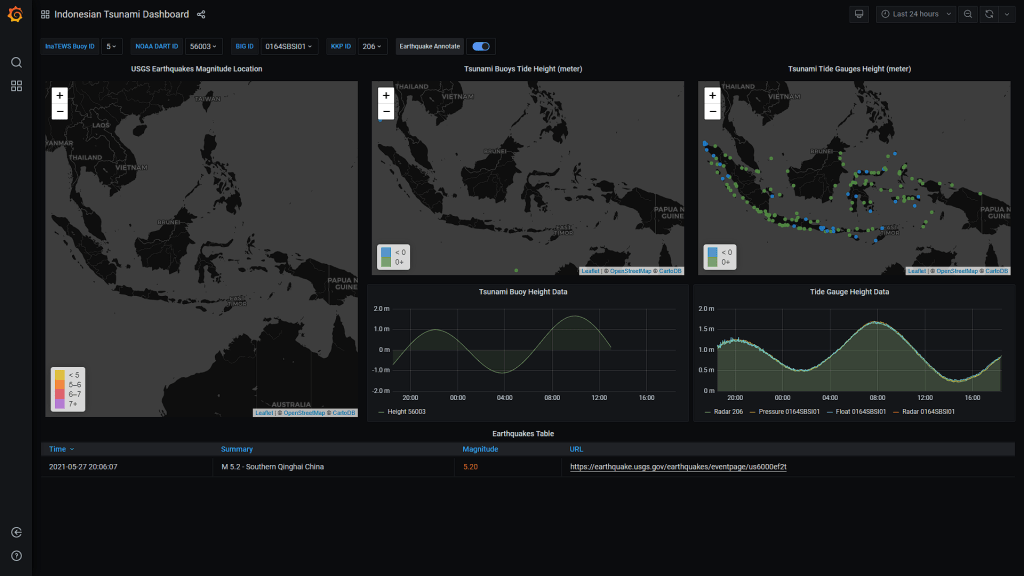 Tsunami-related data in Indonesia consists of earthquake information, buoy time-series data, and tide gauge time-series data. This dashboard uses the API provided by USGS, NOAA, Indonesian Geospatial Information Agency (BIG), and Indonesian Ministry of Fisheries (KKP). This dashboard is a part of the Indonesian National Oceanographic Data Center (https://nodc.id), also accessible in https://grafana.stevenmtd.xyz/