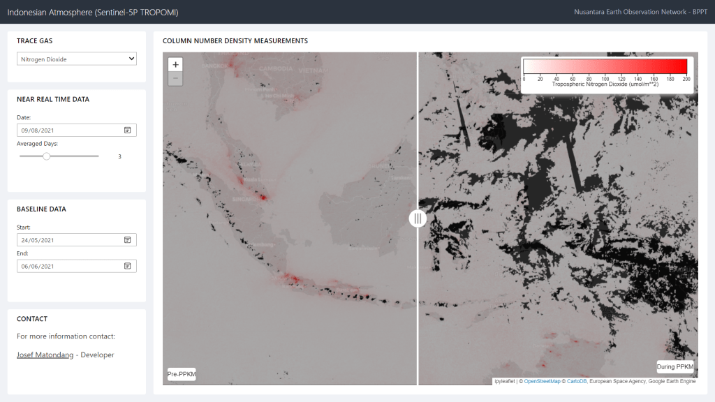 Sentinel-5P shows trace gases measurement through its Tropospheric Monitoring Instrument. This dashboard helps visualize the impact of mobility reduction from COVID-19 restriction. Built with voila, jupyter-flex, ipywidgets, and ipyleaflet. (https://indo-tropomi.herokuapp.com)